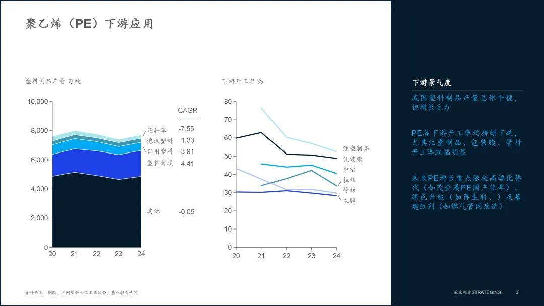 当前制造业产能利用率普遍承压,PE各下游开工率均持续下跌,尤其注塑制品、包装膜、管材开工率跌幅明显。截至2024年,注塑制品开工率为52.42%、包装膜48.80%、中空40.52%、拉丝33.72%、管材29.72%、农膜28.33%,均处于较低水平。未来PE增长重点依托高端化替代(如茂金属PE国产化率)、绿色升级(如再生料、)及基建红利(如燃气管网改造)。