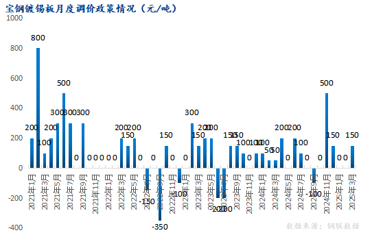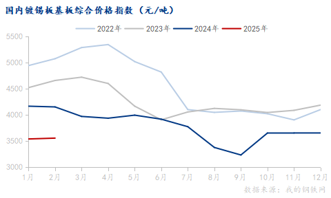 从钢厂镀锡板调价政策看,2月马口铁基料综合成本维持区间震荡,国营企业出厂价坚挺,民营企业出厂价节后调价幅度不大,主流出厂价在5700-6000元/吨。2月份邯邢热卷结算价格SPHC3390元/吨,月环比上涨10元/吨。宝钢股份2025年3月份订货政策在2025年2月份的基础上基价上调150元/吨,预计四月期货指导价将继续上调。