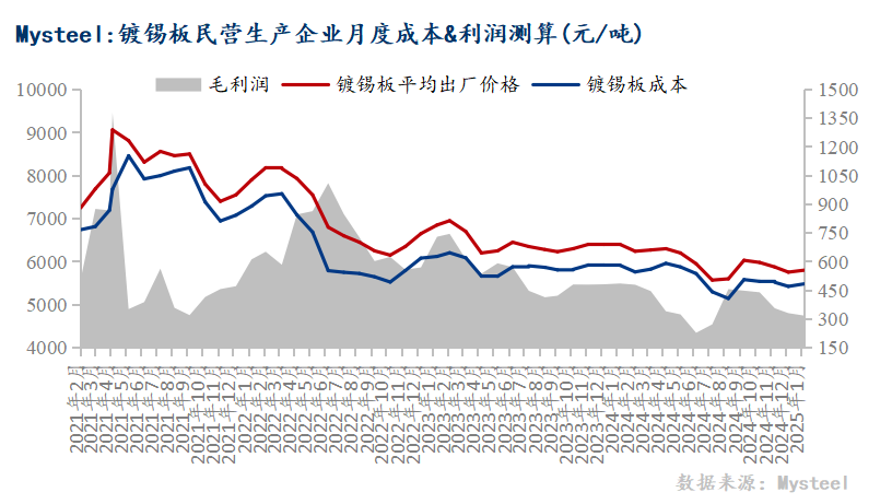 Mysteel对民营企业成本&利润测算数据显示:2025年2月份镀锡板生产成本5482.01元/吨,月环比上涨57.77元/吨,毛利317.99元/吨,月环比下滑12.77元/吨,全流程企业整体利润尚可。备注:1、镀锡板以0.2mm厚度镀锡量2.8/2.8g为基准;2、热轧C料3.0mm为多家钢厂出厂价格加权成本(含税自提,不含运费以及其他费用);3、锡锭价格选取主流市场沪锡当月平均价格折算吨钢耗锡成本。