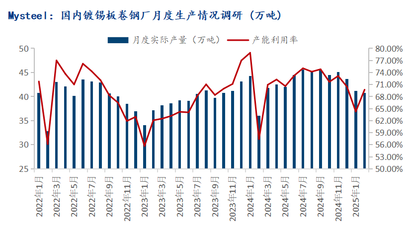 据Mysteel监测的重点镀锡板生产企业中,2025年2月份开工率78%, 产能利用率69.71%;2月镀锡板实际产量40.74万吨,月环比减少0.43万吨,同样本厂库18.33万吨,月环比减少2.45万吨;另外,Mysteel对国内重点镀铬生产企业调研数据显示,2月份镀铬板产量共计12.5万吨,月环比增加1.39万吨。 总体来看,2月份马口铁供应继续窄幅下滑,主要是春节假期部分企业有检修计划且2月整体周期较短,预计3月国内马口铁供应会回升。