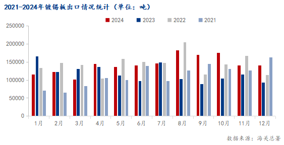 综合来看,2024年全年镀锡板和镀铬板出口表现相较于前两年增速明显,8-10月份马口铁出口量增长明显,11-12月出口量窄幅下滑,全年出口总量并未超过2022年水平。