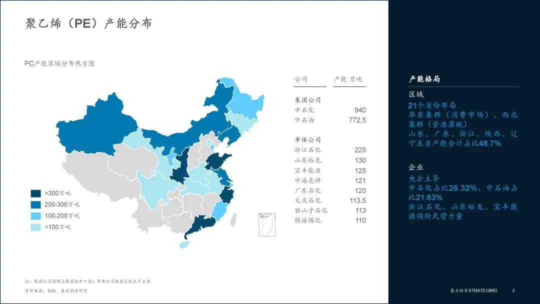 我国PE产业立足资源禀赋与市场纵深,持续优化产能布局和产业结构。截至2024年底,全国有21个省份布局PE生产装置,形成以消费市场为导向的华东集群(产能1286万吨,占全国36.01%)和以资源禀赋为核心的西北煤基烯烃集群(产能765万吨,占全国21.42%),山东(390万吨)、广东(389万吨)、浙江(375万吨)、陕西(302万吨)、辽宁(270万吨)五省产能合计占比48.7%,构建多极支撑体系。企业格局则呈现央企主导、国有资本与民营经济协同发展态势,中石化集团(940万吨,26.32%)、中石油集团(772.5万吨,21.63%)主导基础供应;浙江石化(225万吨)、山东裕龙(130万吨)、宝丰能源(125万吨)领衔民营力量深度参与产业升级。